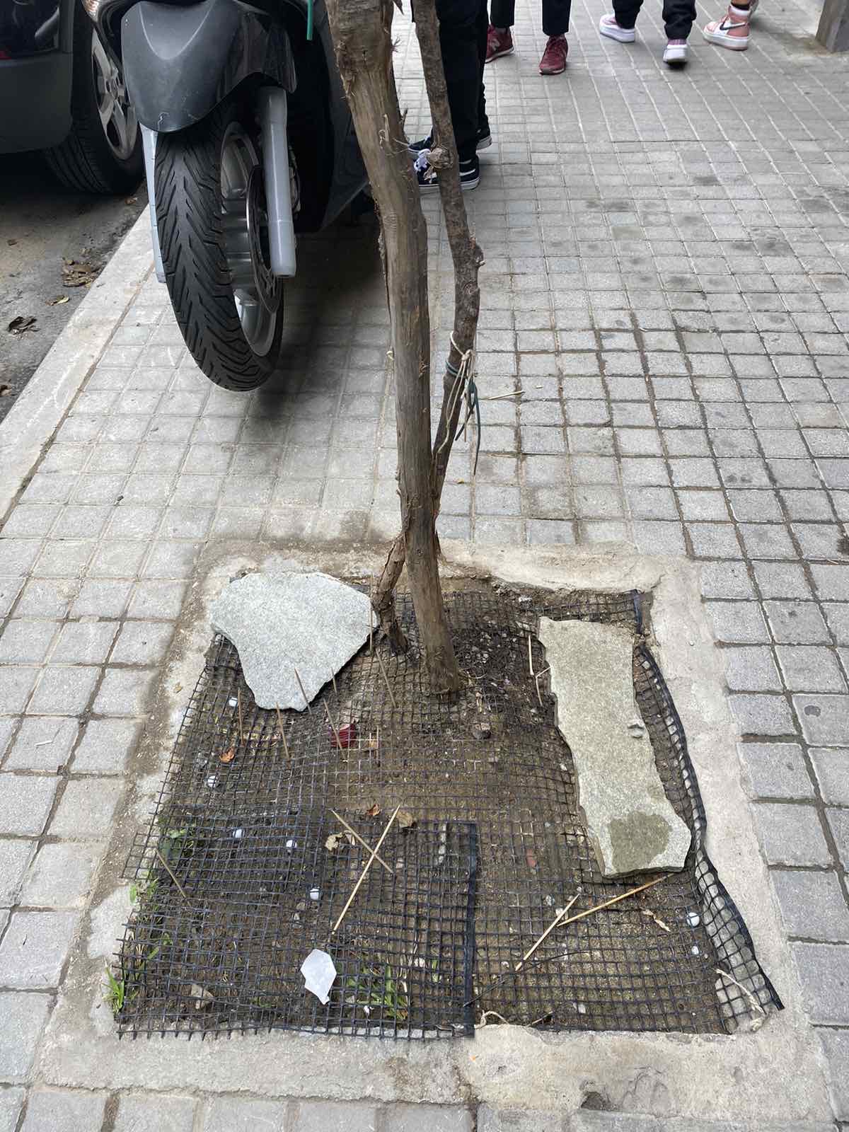 Σε δενδροδόχο επί της οδού Αισχύλου 3, κάποιος/α έχει τοποθετήσει ένα πλέγμα και ανάμεσα στα κενά, όρθια ξυλάκια από σουβλάκια. Επικίνδυνο.