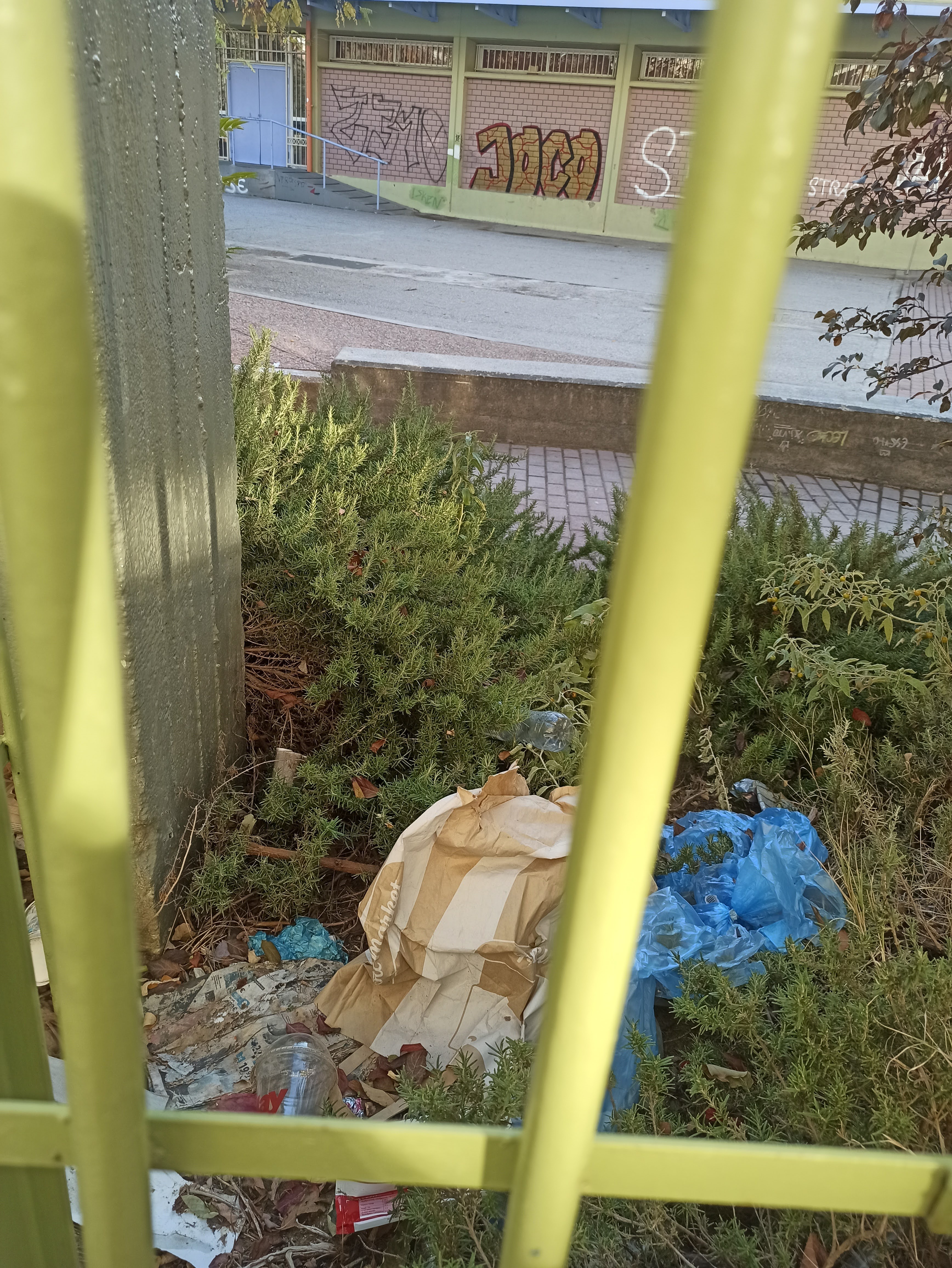 Η αυλή του Σχολείου (1ο Γυμνάσιο Χαριλάου από την οδό Κορίνθου ) σε ένα μέρος θυμίζει ζούγκλα μόνο ο "Ταρζαν λείπει" και στο άλλο η βρομιά που είναι και από έξω και από μέσα δεν περιγράφεται.