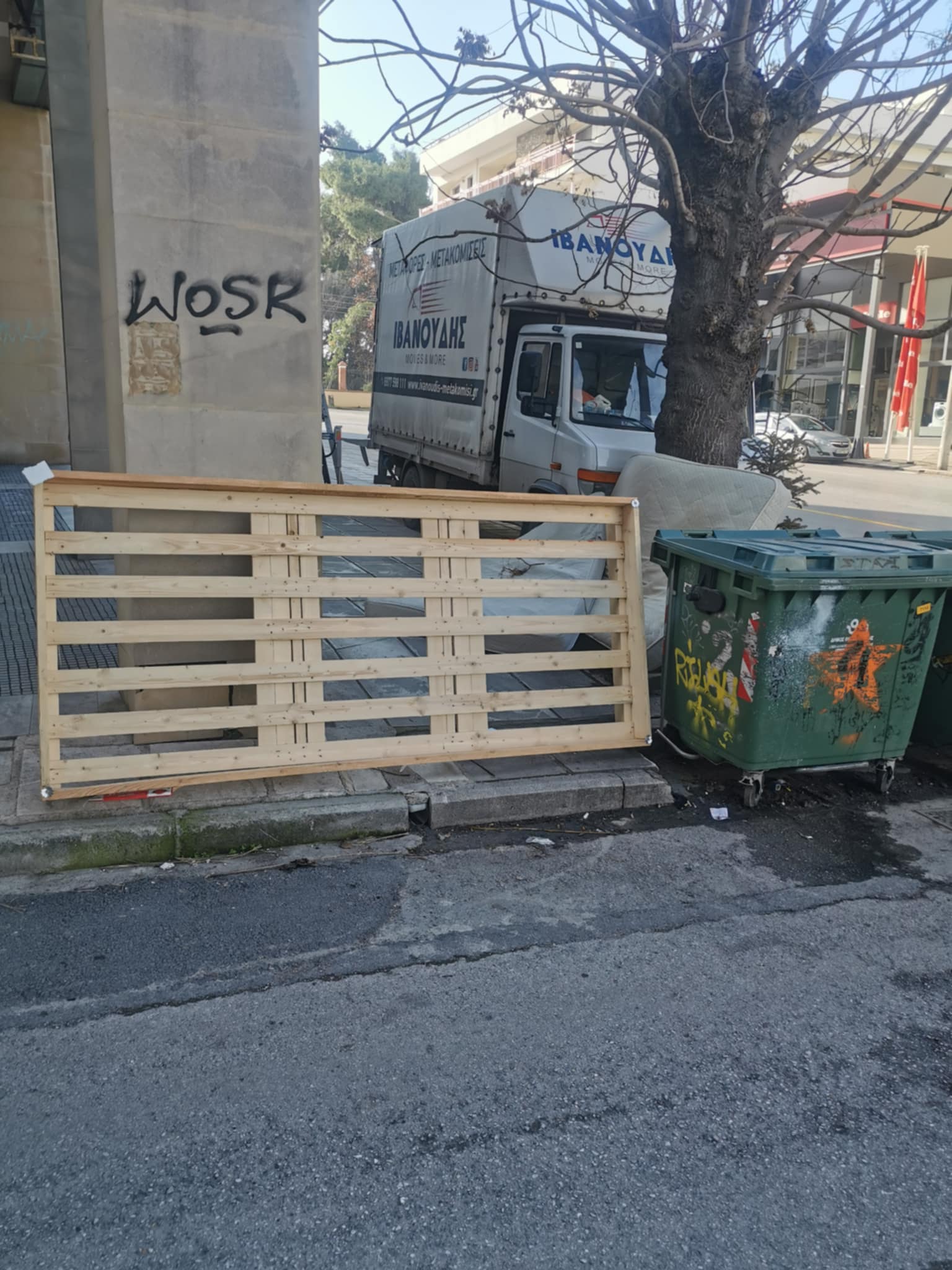Στρώματα και ογκώδη που εγκαταλείφθηκαν δίπλα σε κάδους απορριμμάτων μετά από μετακόμιση στη Λεωφόρο Βασιλίσσης Όλγας 239.