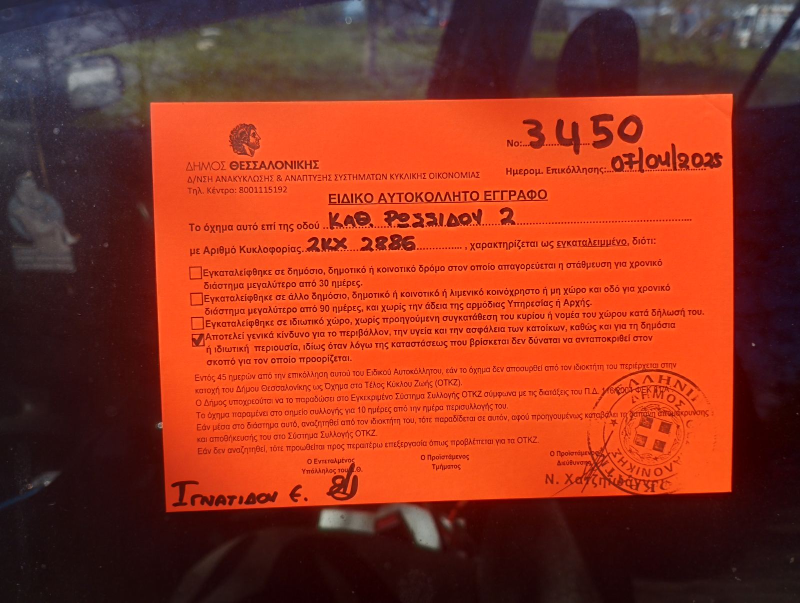 • Σας ενημερώνουμε ότι το όχημα που αναφέρετε κρίθηκε αρχικά ως εγκαταλειμμένο. Στοιχεία για τις αρμοδιότητες μας, καθώς και για τη διαδικασία που ακολουθούμε για τη διεκπεραίωση αιτημάτων, όπως το δικό σας, θα βρείτε στην ιστοσελίδα του Δήμου Θεσσαλονίκης αναζητώντας στον φυλλομετρητή σας (google, bing κλπ) τη φράση: “ΔΗΜΟΣ ΘΕΣΣΑΛΟΝΙΚΗΣ ΕΓΚΑΤΑΛΕΙΜΜΕΝΑ ΟΧΗΜΑΤΑ” Κωτσιόνης Πασχάλης Υπεύθυνος-Συντονιστής Εποπτείας Ανακύκλωσης του Τμήματος & Σχεδιασμού Συστημάτων Κυκλικής οικονομίας