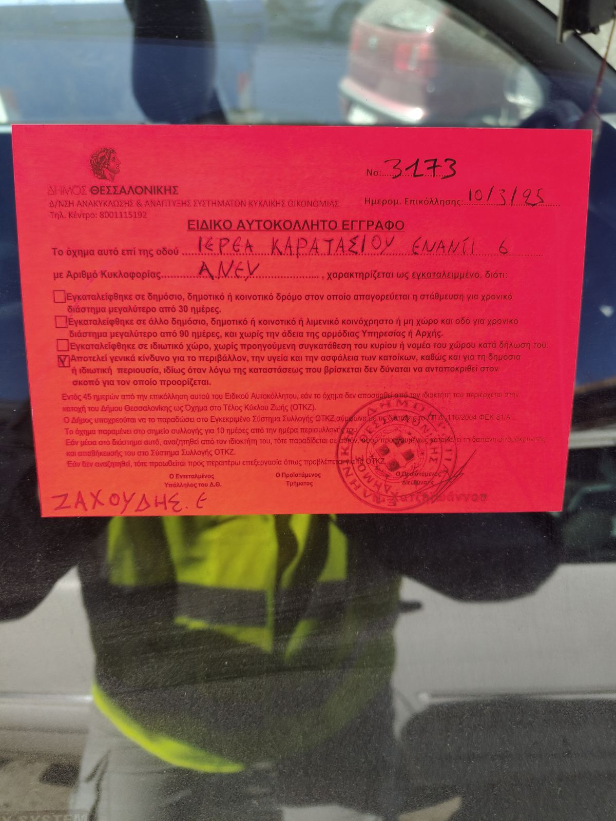 - Σας ενημερώνουμε ότι το όχημα που αναφέρετε κρίθηκε αρχικά ως εγκαταλειμμένο. Στοιχεία για τις αρμοδιότητες μας, καθώς και για τη διαδικασία που ακολουθούμε για τη διεκπεραίωση αιτημάτων, όπως το δικό σας, θα βρείτε στην ιστοσελίδα του Δήμου Θεσσαλονίκης αναζητώντας στον φυλλομετρητή σας (google, bing κλπ) τη φράση: “ΔΗΜΟΣ ΘΕΣΣΑΛΟΝΙΚΗΣ ΕΓΚΑΤΑΛΕΙΜΜΕΝΑ ΟΧΗΜΑΤΑ” Κωτσιόνης Πασχάλης Υπεύθυνος-Συντονιστής Εποπτείας Ανακύκλωσης του Τμήματος & Σχεδιασμού Συστημάτων Κυκλικής οικονομίας