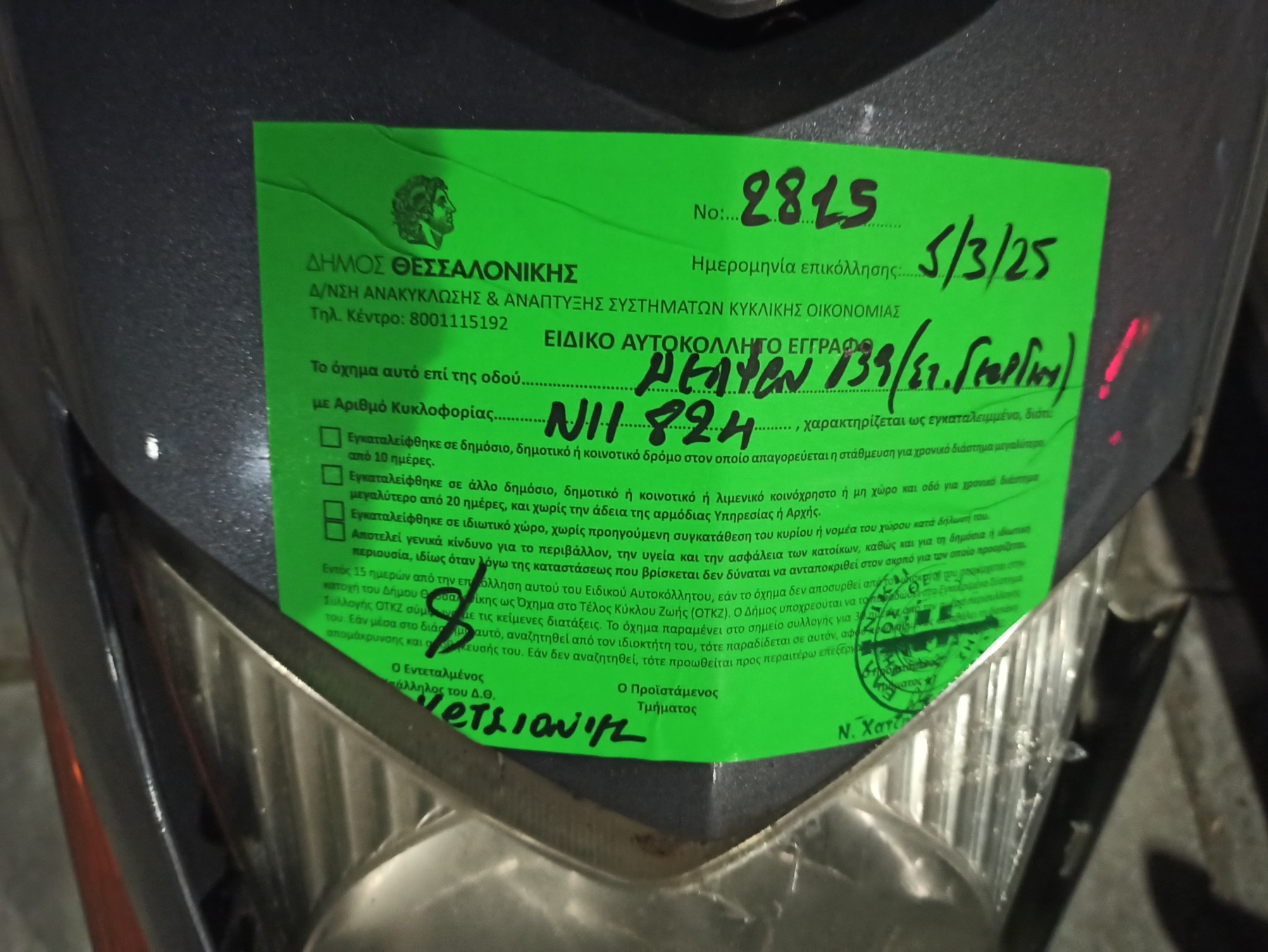 Στην διεύθυνση που σας υποδεικνύω πάνω στην οδό Δελφών, στο πάρκο του γαλαξία, ακριβώς μετά την στάση Γεωργίου, υπάρχουν δύο παρατημένα μηχανάκια. Παρακαλώ για τις άμεσες ενέργειες σας.