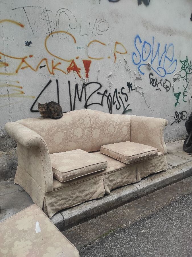 Στην γωνία Σταματίου Ψάλτου & Γυθείου υπάρχουν πολλά ογκώδη, ένας διθέσιος καναπές, 1 τριθέσιος και ένας διαλυμένος . Επίσης πολλές κούτες και κάποια μπάζα