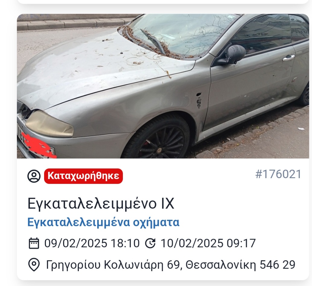 Εγκαταλελειμμένο ΙΧ ασημί Alfa Romeo για πανω από 5 μήνες επι της οδού Γρηγορίου Κολωνιάρη 71 στην Ξηροκρήνη.Έχει ξαναγίνει καταγγελία στις 09/02/2025 και ο Δήμος τοποθέτησε στις 18/02/25 κόκκινο αυτοκόλλητο ενημέρωσης το οποίο έχει πλεον σκιστεί πιθανόν από τον ιδιοκτήτη, ενω το αυτοκίνητο παραμένει στην ιδια θέση εγκαταλελειμμένο. Παρακαλώ να πράξετε αναλόγως.