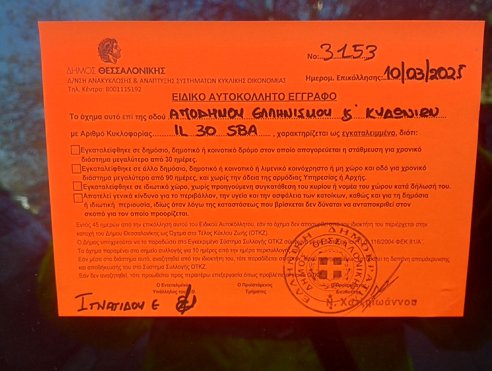 Διεύθυνση Ανακύκλωσης και Διαχείρισης Αστικών Αποριμμάτων, Καθαριότητα - Τμήμα Ανακύκλωσης - Εγκαταλειμμένα Οχήματα