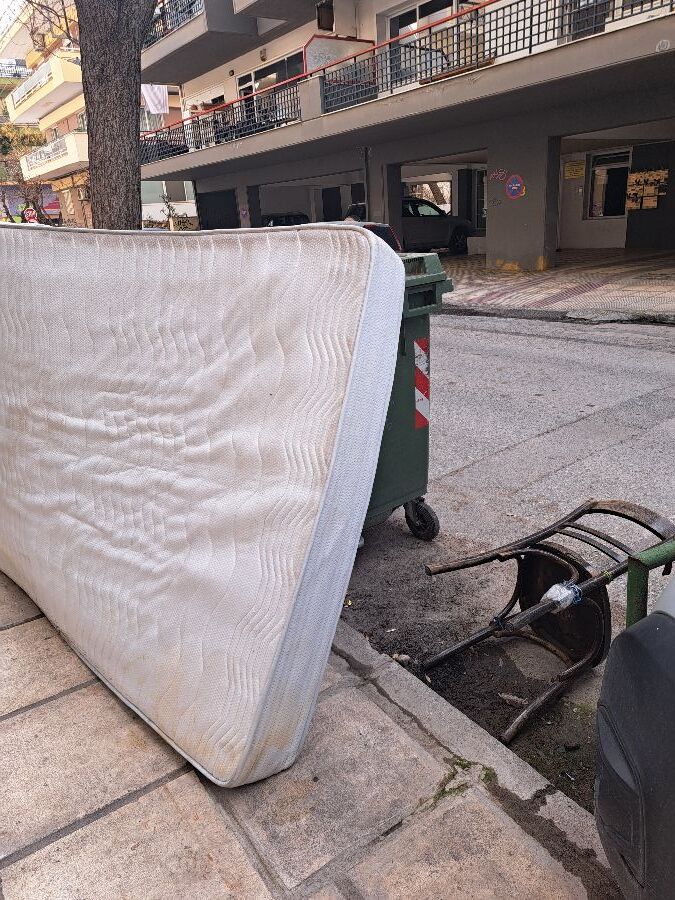 Υπάρχει εδώ και μερες ένα πεταμένο στρώμα δίπλα στον κάδο. Και μια καρέκλα.