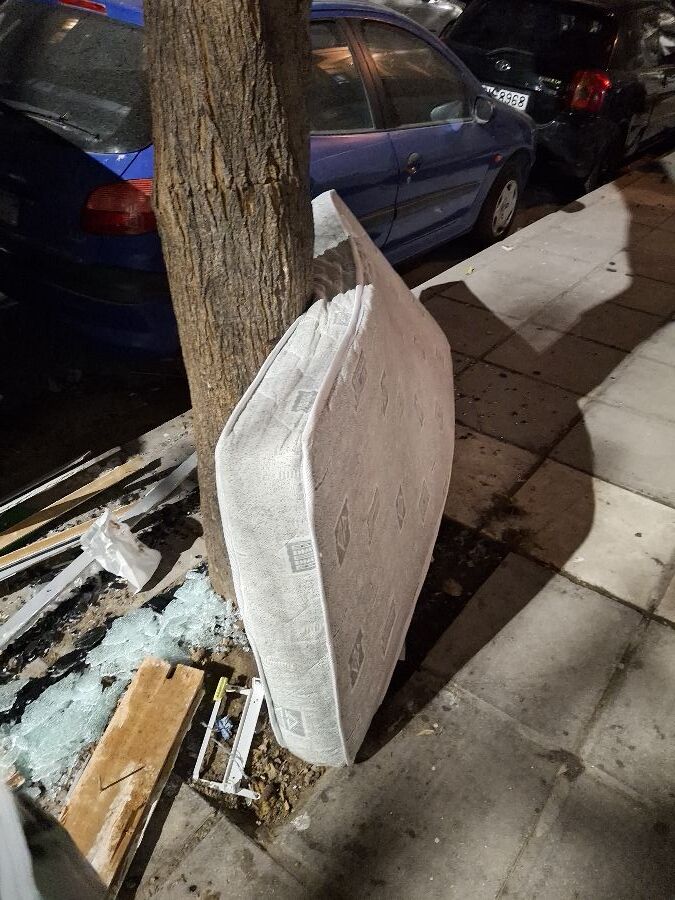 Στους κάδους έχουν αφήσει διαφορά κομμάτια από έπιπλα, ένα στρώμα και κάτι γυάλινο που όπως φαίνεται και στις φωτογραφίες έσπασε και πλέον είναι επικίνδυνο.