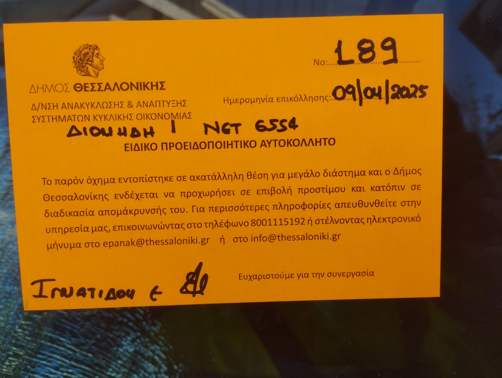 • Σας ενημερώνουμε ότι έγινε επιτόπιος έλεγχος του αιτήματός σας από υπάλληλο της υπηρεσίες μας. Στοιχεία για τις αρμοδιότητες μας, καθώς και για τη διαδικασία που ακολουθούμε για τη διεκπεραίωση αιτημάτων, όπως το δικό σας, θα βρείτε στην ιστοσελίδα του Δήμου Θεσσαλονίκης αναζητώντας στον φυλλομετρητή σας (google, bing κλπ) τη φράση: “ΔΗΜΟΣ ΘΕΣΣΑΛΟΝΙΚΗΣ ΕΓΚΑΤΑΛΕΙΜΜΕΝΑ ΟΧΗΜΑΤΑ” Κωτσιόνης Πασχάλης Υπεύθυνος-Συντονιστής Εποπτείας Ανακύκλωσης του Τμήματος & Σχεδιασμού Συστημάτων Κυκλικής οικονομίας
