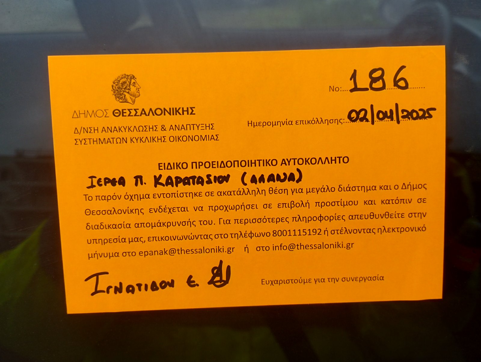 - Σας ενημερώνουμε ότι έγινε επιτόπιος έλεγχος του αιτήματός σας από υπάλληλο της υπηρεσίες μας. Στοιχεία για τις αρμοδιότητες μας, καθώς και για τη διαδικασία που ακολουθούμε για τη διεκπεραίωση αιτημάτων, όπως το δικό σας, θα βρείτε στην ιστοσελίδα του Δήμου Θεσσαλονίκης αναζητώντας στον φυλλομετρητή σας (google, bing κλπ) τη φράση: “ΔΗΜΟΣ ΘΕΣΣΑΛΟΝΙΚΗΣ ΕΓΚΑΤΑΛΕΙΜΜΕΝΑ ΟΧΗΜΑΤΑ” Κωτσιόνης Πασχάλης Υπεύθυνος-Συντονιστής Εποπτείας Ανακύκλωσης του Τμήματος & Σχεδιασμού Συστημάτων Κυκλικής οικονομίας