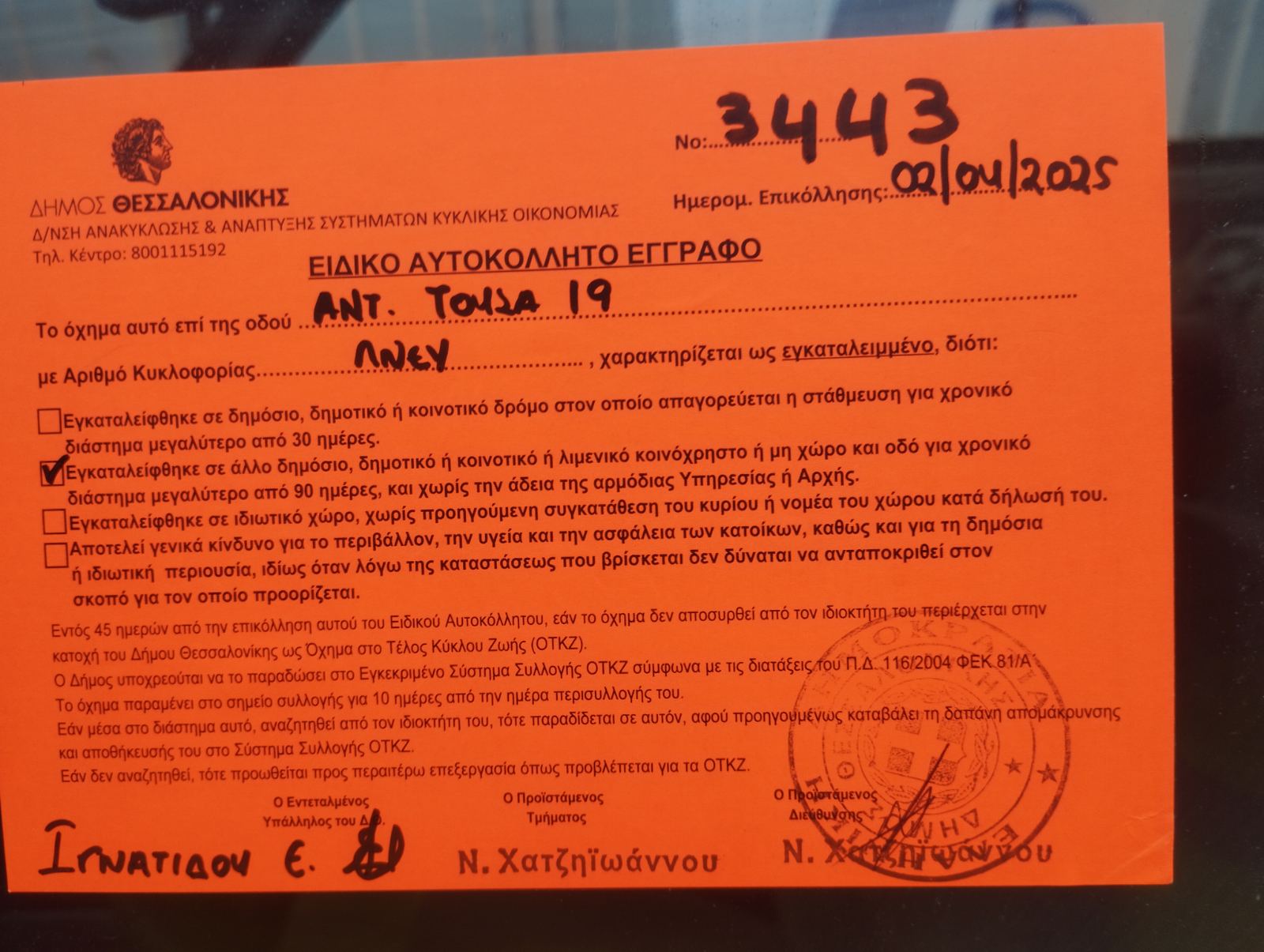 • Σας ενημερώνουμε ότι το όχημα που αναφέρετε κρίθηκε αρχικά ως εγκαταλειμμένο. Στοιχεία για τις αρμοδιότητες μας, καθώς και για τη διαδικασία που ακολουθούμε για τη διεκπεραίωση αιτημάτων, όπως το δικό σας, θα βρείτε στην ιστοσελίδα του Δήμου Θεσσαλονίκης αναζητώντας στον φυλλομετρητή σας (google, bing κλπ) τη φράση: “ΔΗΜΟΣ ΘΕΣΣΑΛΟΝΙΚΗΣ ΕΓΚΑΤΑΛΕΙΜΜΕΝΑ ΟΧΗΜΑΤΑ” Κωτσιόνης Πασχάλης Υπεύθυνος-Συντονιστής Εποπτείας Ανακύκλωσης του Τμήματος & Σχεδιασμού Συστημάτων Κυκλικής οικονομίας