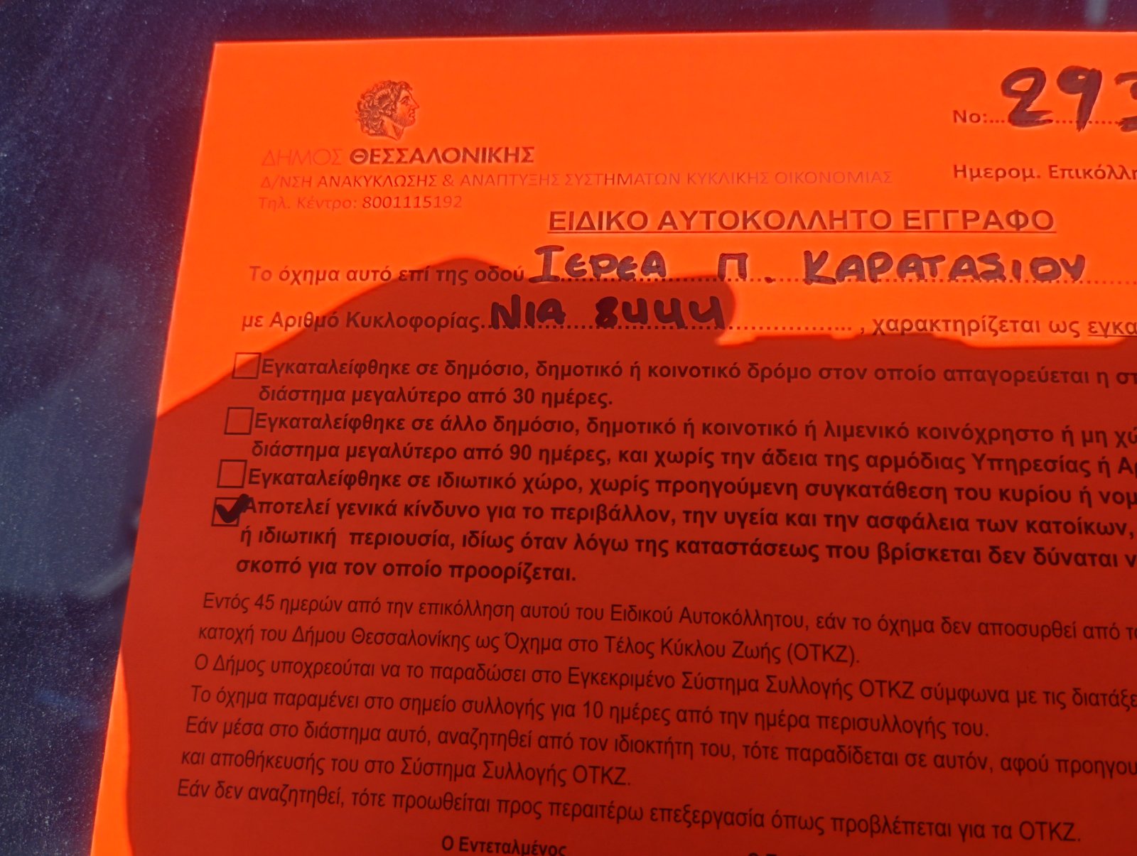 • Σας ενημερώνουμε ότι το όχημα που αναφέρετε κρίθηκε αρχικά ως εγκαταλειμμένο. Στοιχεία για τις αρμοδιότητες μας, καθώς και για τη διαδικασία που ακολουθούμε για τη διεκπεραίωση αιτημάτων, όπως το δικό σας, θα βρείτε στην ιστοσελίδα του Δήμου Θεσσαλονίκης αναζητώντας στον φυλλομετρητή σας (google, bing κλπ) τη φράση: “ΔΗΜΟΣ ΘΕΣΣΑΛΟΝΙΚΗΣ ΕΓΚΑΤΑΛΕΙΜΜΕΝΑ ΟΧΗΜΑΤΑ” Κωτσιόνης Πασχάλης Υπεύθυνος-Συντονιστής Εποπτείας Ανακύκλωσης του Τμήματος & Σχεδιασμού Συστημάτων Κυκλικής οικονομίας