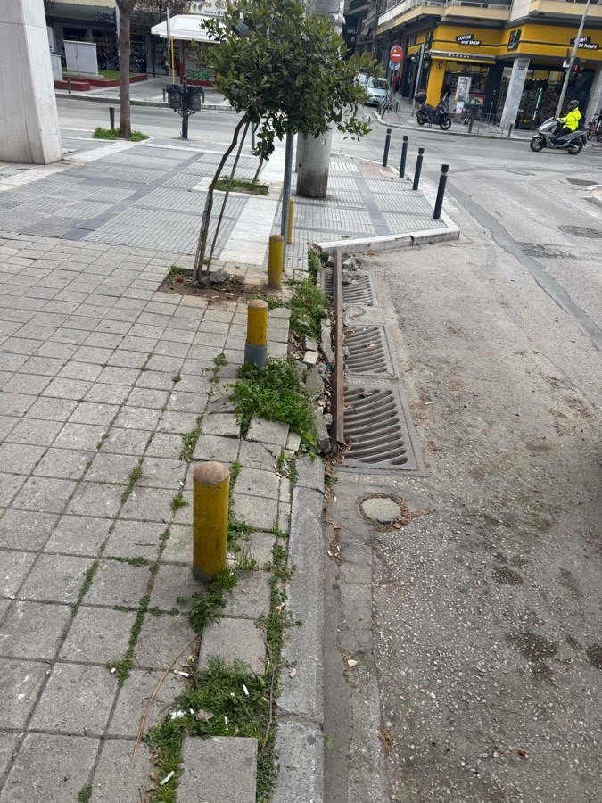 Το ρείθρο του πεζοδρομίου έχει καταστραφεί τέλειων και είναι επικιπνδυνο για πεζούς, οχήματα αλλά και για τις παρακείμενες αποχετεύσεις!