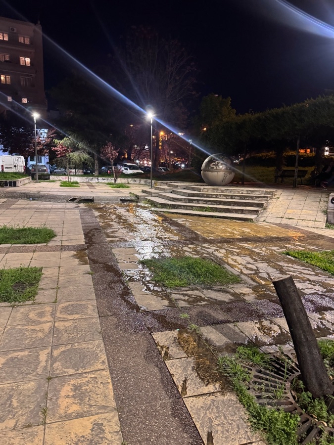 Στην μικρή πλατεία στην Βούλγαρη έχει βουλώσει το Συντριβάνι και τρέχουν τα νερά μέχρι κάτω στο δρόμο