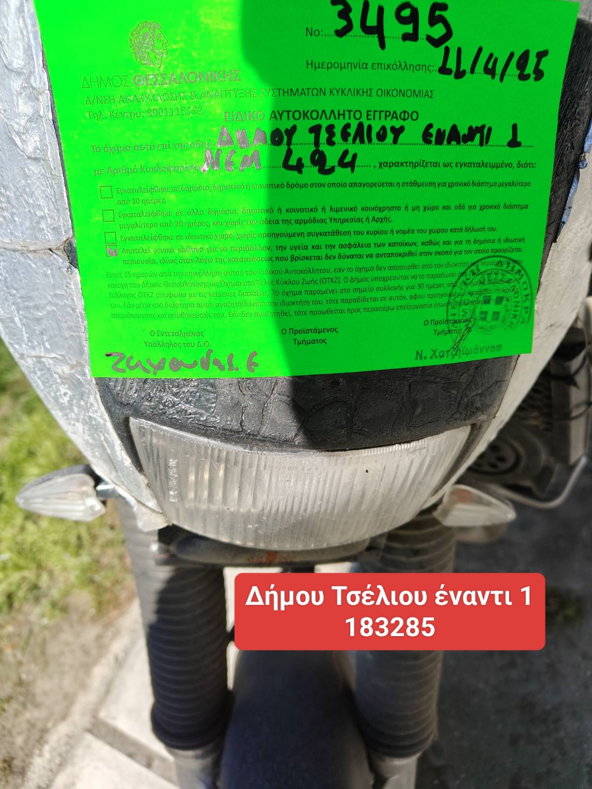 • Σας ενημερώνουμε ότι το όχημα που αναφέρετε κρίθηκε αρχικά ως εγκαταλειμμένο. Στοιχεία για τις αρμοδιότητες μας, καθώς και για τη διαδικασία που ακολουθούμε για τη διεκπεραίωση αιτημάτων, όπως το δικό σας, θα βρείτε στην ιστοσελίδα του Δήμου Θεσσαλονίκης αναζητώντας στον φυλλομετρητή σας (google, bing κλπ) τη φράση: “ΔΗΜΟΣ ΘΕΣΣΑΛΟΝΙΚΗΣ ΕΓΚΑΤΑΛΕΙΜΜΕΝΑ ΟΧΗΜΑΤΑ” Κωτσιόνης Πασχάλης Υπεύθυνος-Συντονιστής Εποπτείας Ανακύκλωσης του Τμήματος & Σχεδιασμού Συστημάτων Κυκλικής οικονομίας