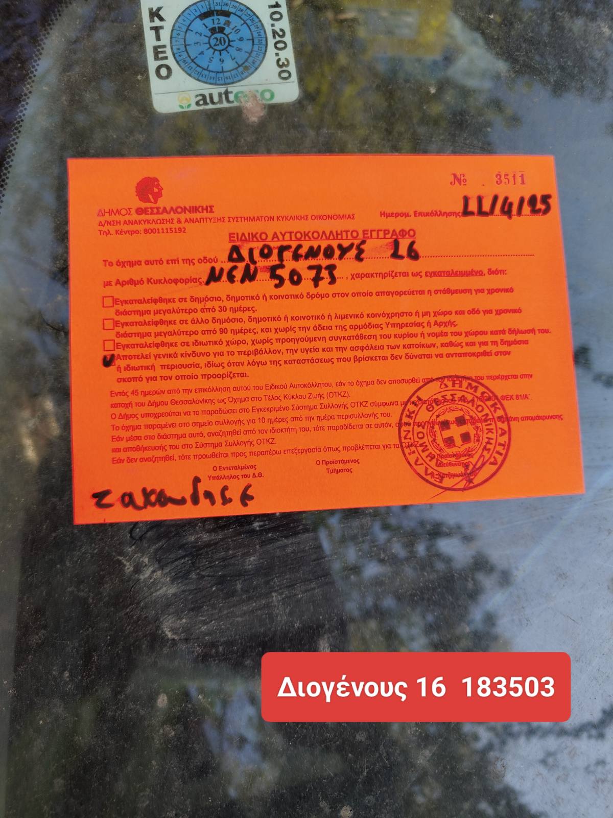 • Σας ενημερώνουμε ότι το όχημα που αναφέρετε κρίθηκε αρχικά ως εγκαταλειμμένο. Στοιχεία για τις αρμοδιότητες μας, καθώς και για τη διαδικασία που ακολουθούμε για τη διεκπεραίωση αιτημάτων, όπως το δικό σας, θα βρείτε στην ιστοσελίδα του Δήμου Θεσσαλονίκης αναζητώντας στον φυλλομετρητή σας (google, bing κλπ) τη φράση: “ΔΗΜΟΣ ΘΕΣΣΑΛΟΝΙΚΗΣ ΕΓΚΑΤΑΛΕΙΜΜΕΝΑ ΟΧΗΜΑΤΑ” Κωτσιόνης Πασχάλης Υπεύθυνος-Συντονιστής Εποπτείας Ανακύκλωσης του Τμήματος & Σχεδιασμού Συστημάτων Κυκλικής οικονομίας