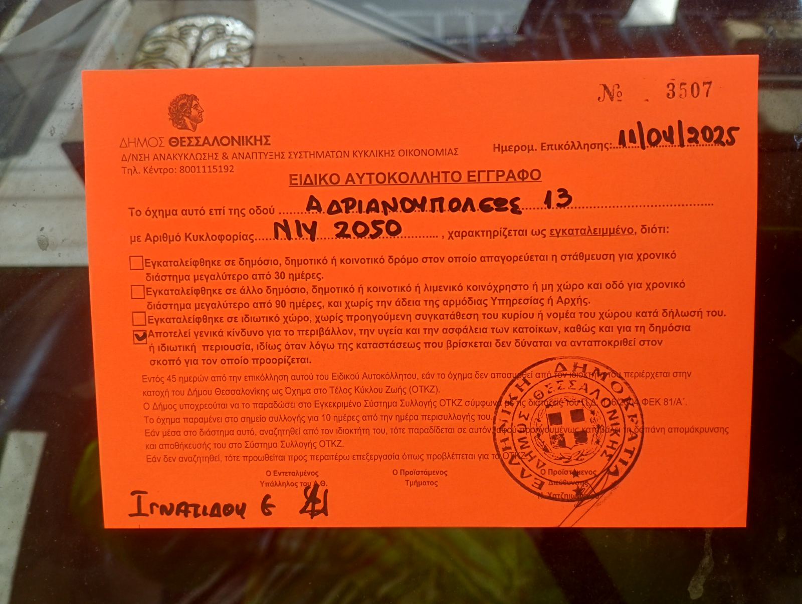 • Σας ενημερώνουμε ότι το όχημα που αναφέρετε κρίθηκε αρχικά ως εγκαταλειμμένο. Στοιχεία για τις αρμοδιότητες μας, καθώς και για τη διαδικασία που ακολουθούμε για τη διεκπεραίωση αιτημάτων, όπως το δικό σας, θα βρείτε στην ιστοσελίδα του Δήμου Θεσσαλονίκης αναζητώντας στον φυλλομετρητή σας (google, bing κλπ) τη φράση: “ΔΗΜΟΣ ΘΕΣΣΑΛΟΝΙΚΗΣ ΕΓΚΑΤΑΛΕΙΜΜΕΝΑ ΟΧΗΜΑΤΑ” Κωτσιόνης Πασχάλης Υπεύθυνος-Συντονιστής Εποπτείας Ανακύκλωσης του Τμήματος & Σχεδιασμού Συστημάτων Κυκλικής οικονομίας
