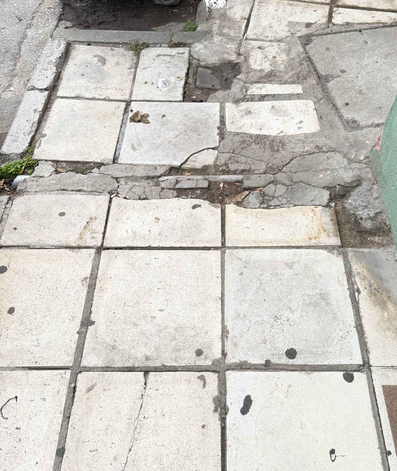 Σπασμένα πλακάκια δίπλα στη θέση του κάδου και μπροστά στο μαγαζί με αποτέλεσμα να γίνεται εστία μόλυνσης από ακαθαρσίες γάτας