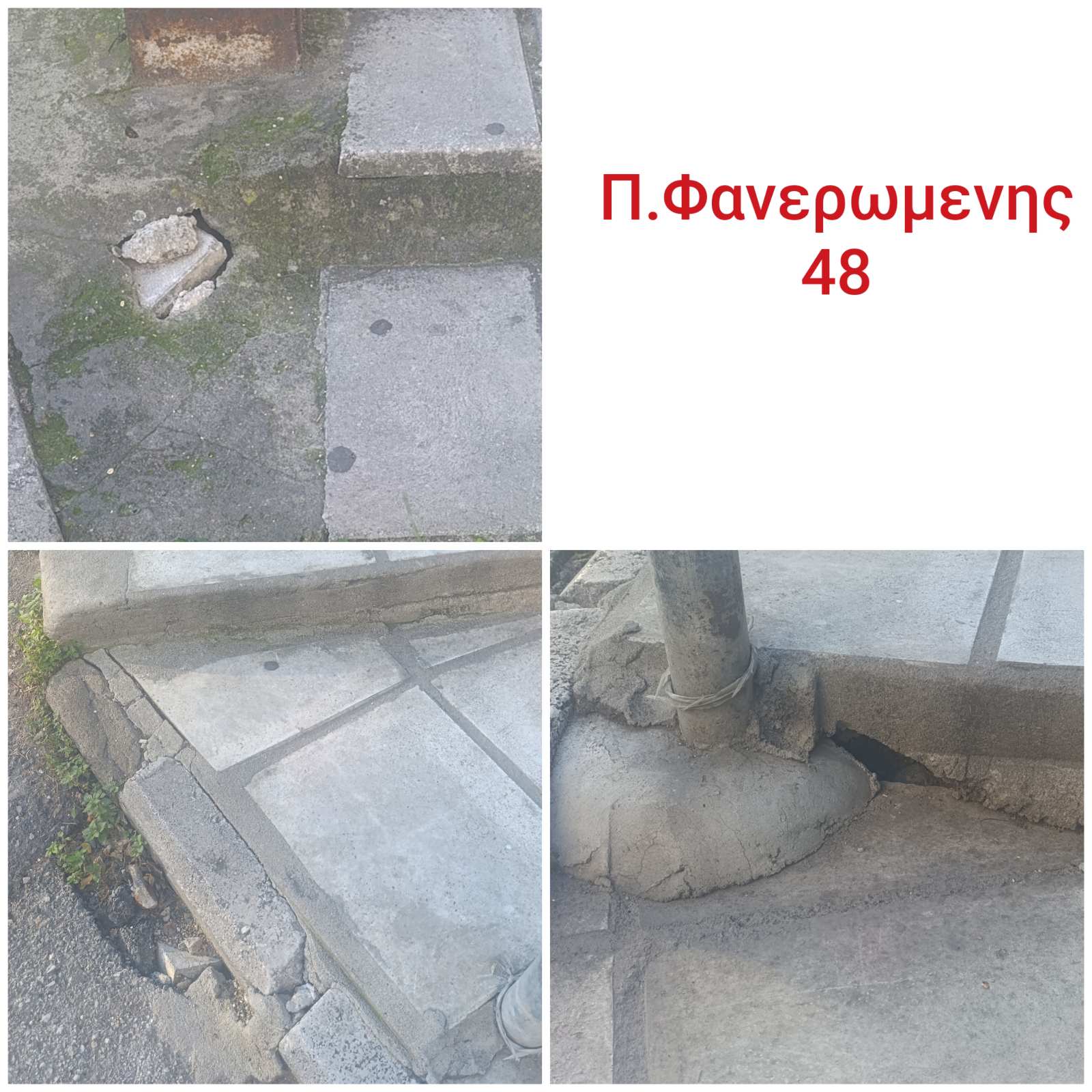 Π. ΦΑΝΕΡΩΜΕΝΗΣ 48 ΜΕ ΣΚΑΛΙΑ ΚΑΥΚΑΣΟΥ, ΥΠΑΡΧΟΥΝ ΒΑΘΙΕΣ ΤΡΥΠΕΣ ΣΤΟ ΟΔΟΣΤΡΩΜΑ ΚΑΙ ΣΤΑ ΣΚΑΛΙΑ. ΟΙ ΔΗΜΟΤΕΣ ΠΡΟΣΠΑΘΟΥΝ ΠΡΟΣΩΡΙΝΑ ΝΑ ΤΙΣ ΚΑΛΥΨΟΥΝ ΜΕ ΠΕΤΡΕΣ ΚΑΙ ΧΩΜΑ.