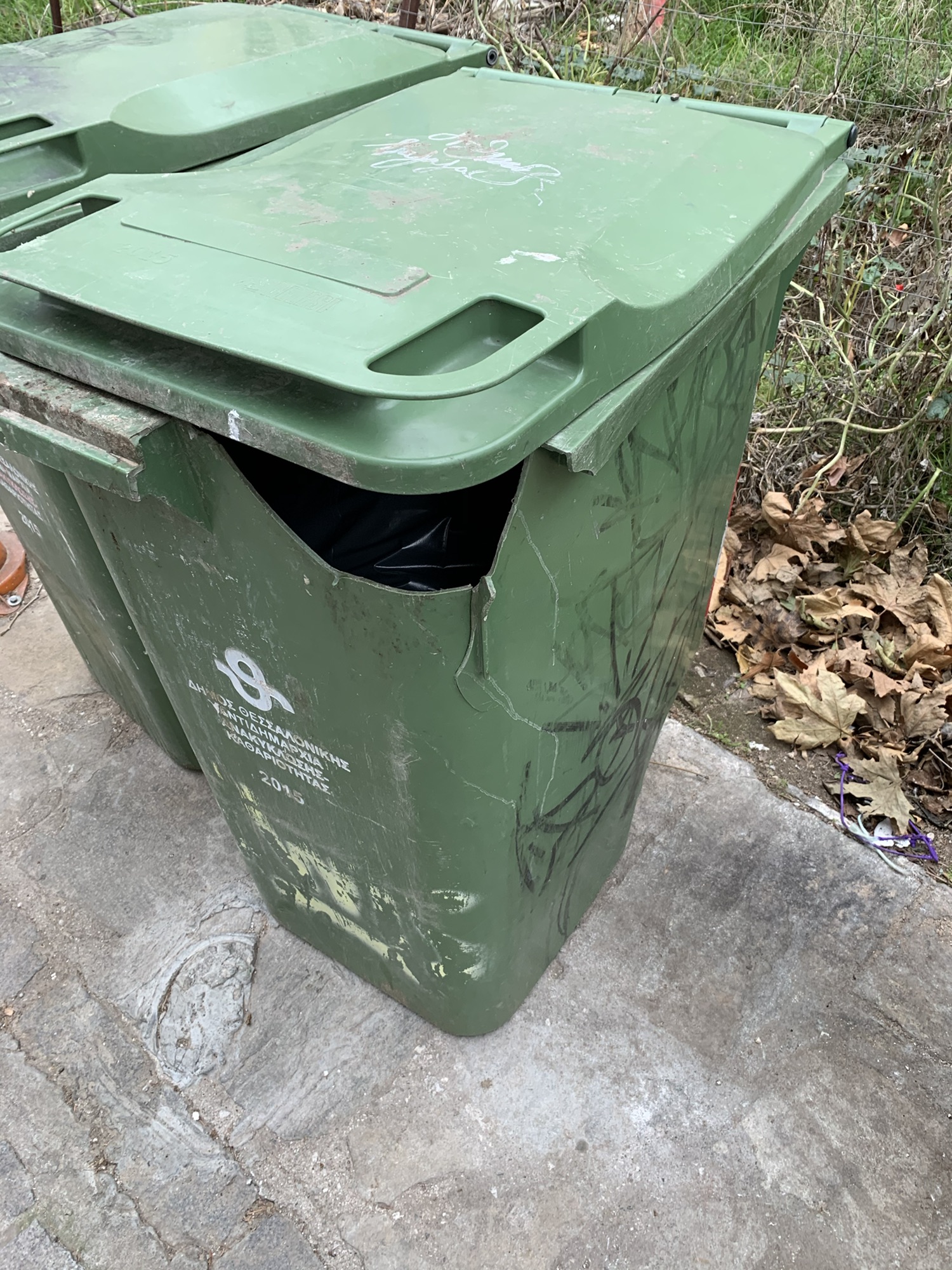 2 σπασμένοι κάδοι. Ένας τετράγωνος πράσινος πλαστικός & ένας μπλε μεγάλος ορθογώνιος ανακύκλωσης.