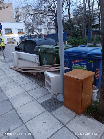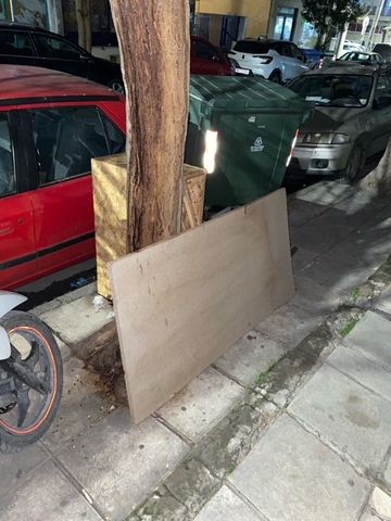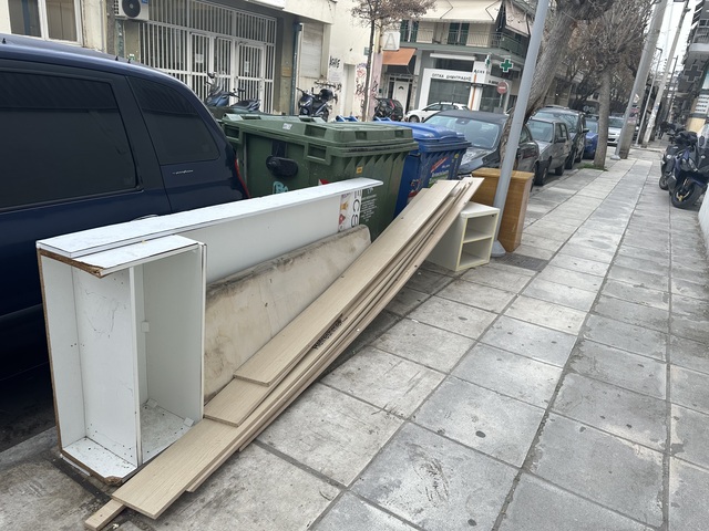 Κομματια ξυλου και επιπλα εγκαταλελειμμενα μπροστα στην εισοδο του Σκλαβενιτη, απεναντι απο Πλαταιων 26 (ΙΚΑ)