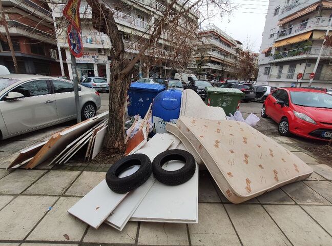 Εδώ και μέρες βρίσκονται ογκώδη από ανακαίνιση καθώς και στρώματα δίπλα στους κάδους