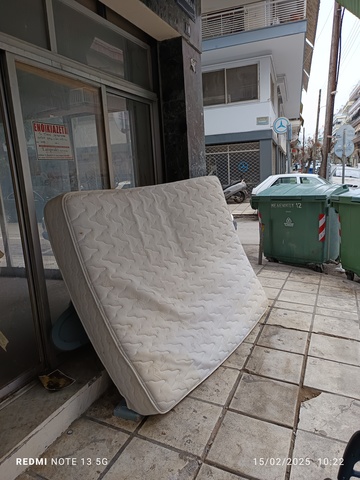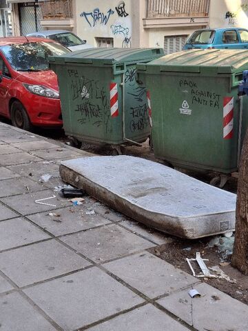 Υπάρχει κρεβάτι και στρώμα στο πεζοδρόμιο στον κάδο σκουπιδιών δίπλα