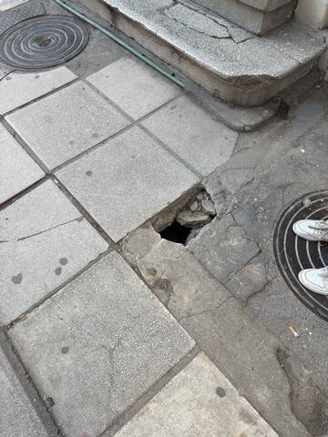 Εχει φύγει κομμάτι του τσιμέντου που συγκρατεί το καπάκι του φρεατίου αποχέτευσης και υπάρχει κενό. Κάθε μέρα σπάει και παραπάνω. Επικίνδυνο για ατύχημα από περαστικούς.