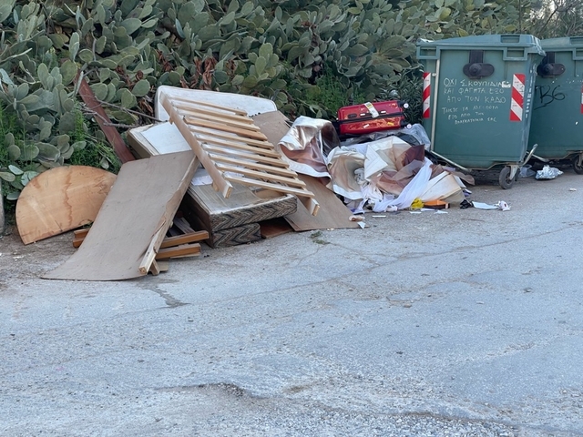 Πεταμένα μπάζα σε κάδο απορριμμάτων. Ψυκτικές συσκευές, ντουλάπες και άλλα αντικείμενα.