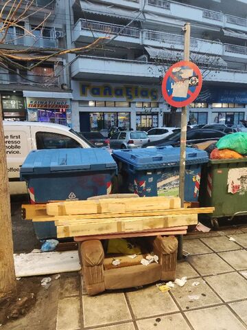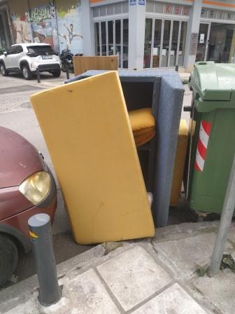 Στους κάδους έχουν αφήσει διαφορά κομμάτια από έπιπλα, ένα στρώμα και κάτι γυάλινο που όπως φαίνεται και στις φωτογραφίες έσπασε και πλέον είναι επικίνδυνο.