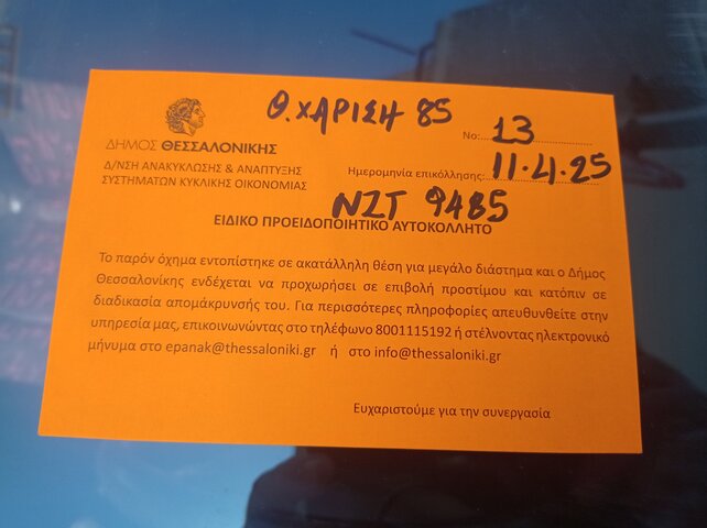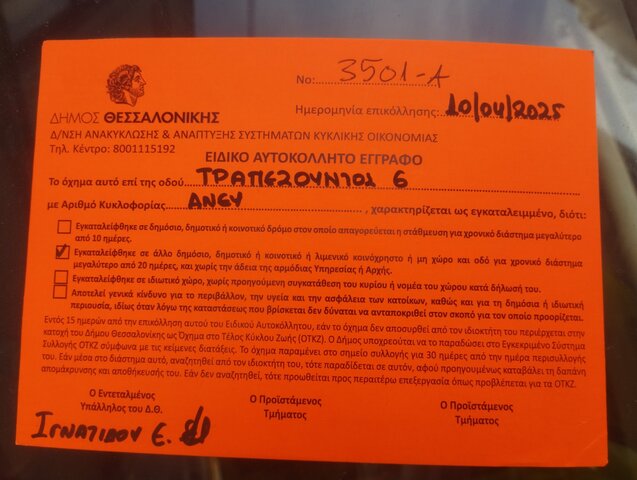 Πίσω από την εκκλησια της Αναληψέως,συγκεκριμένα τραπεζούντος 9,βρισκεται παρατημενο οχημα χωρις πινακιδες.παρακαλειται ο έλεγχος και η απομακρυνση του. ευχαριστω πολυ.