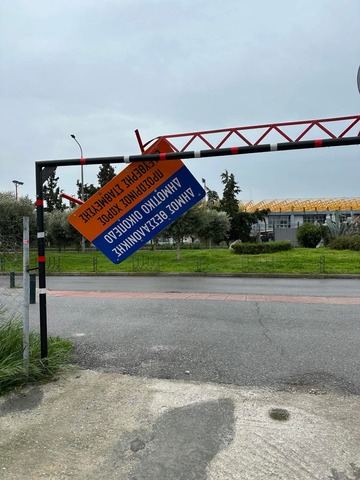 Στην είσοδο του δημοτικού πάρκινγκ δίπλα στο λυόμενο σχολείο λόγω του αέρα η πινακίδα έχει ξεκολλήσει και αιωρείται στην είσοδο του Parking