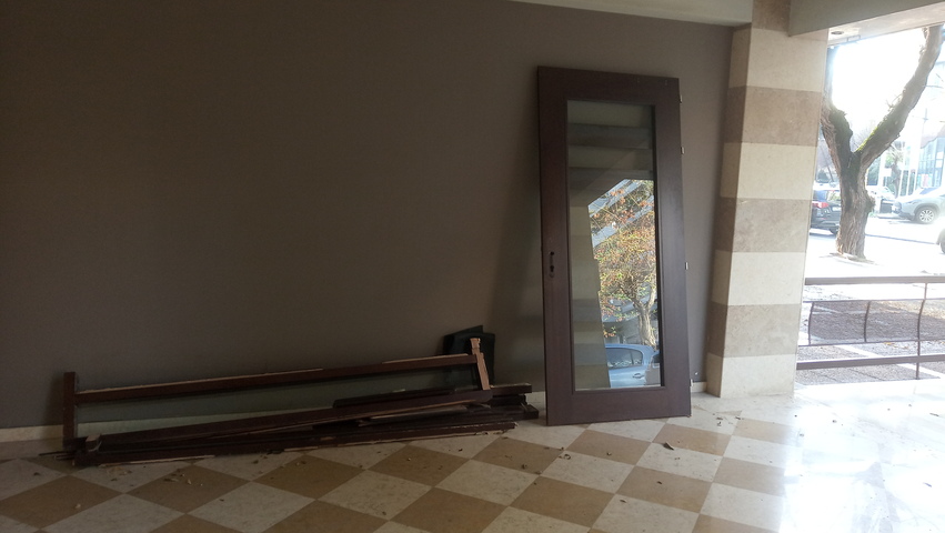 Ξύλινη πόρτα οικοδομής. Βρίσκεται εντός των ορίων της οικοδομής κοντά στην εξώπορτα