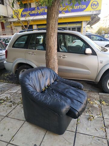 Μια δερμάτινη μαύρη πολυθρόνα στη μέση του πεζοδρομίου