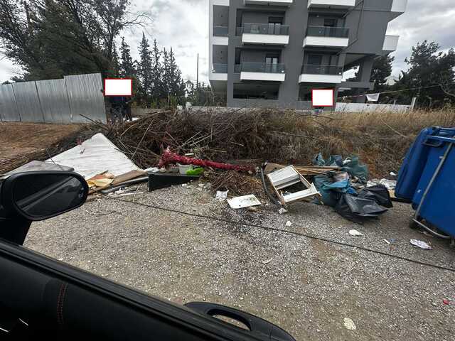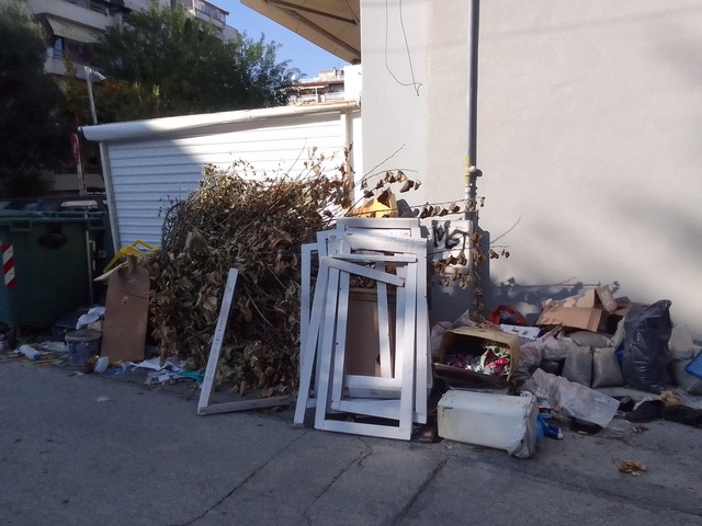 Δίπλα στους κάδους σκουπιδιών έχει σακούλες με μπάζα και ξύλινα κουφώματα