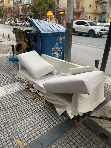 Βρίσκεται στην οδό Αλεξάνδρειας 113, τκ 54646,στο πεζοδρόμιο διπλα στους καδους, μεσα απο τα χαμηλα καγκελα της αυλης της πολυκατοικίας στο 5ο δημοτικό διαμέρισμα, ντεπω, ένα στρώμα διπλό και ένα επιπλο ολόκληρο σαν μπουφες. Προφανώς τοποθετήθηκε εκεί και όχι δίπλα στους...
