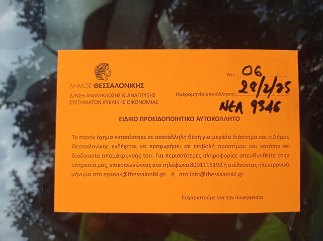 Όχημα μάρκας Renault, το οποίο βρίσκεται σταθμευμένο χωρίς πινακίδες κυκλοφορίας, φέρει το ειδικό αυτοκόλλητο εγκαταλελειμμένου οχήματος για πολλούς μήνες. Παρακαλούμε για τις απαραίτητες ενέργειες απομάκρυνσής του, σύμφωνα με την ισχύουσα νομοθεσία.
