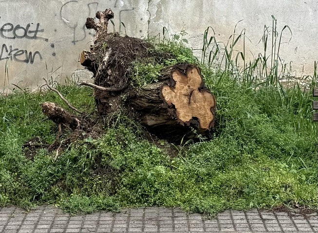 Μετά από προηγούμενο αίτημα απομακρύνθηκε ο κορμός του δέντρου που έκλεινε τον δρόμο όμως στο σημείο παραμένει ξεριζωμένο το κατώτερο τμήμα του κορμού και η ρίζα. Από αισθητικής άποψης λοιπόν το πρόβλημα παραμένει. Τέλος, φανταστείτε πόσο καλύτερα θα ηταν αν στη θέση του...