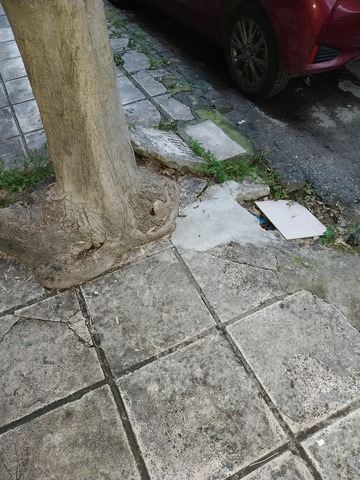 Πεζοδρόμιο σε άθλια κατάσταση σε όλο το μήκος του. Σπασμένες πλάκες και ανασηκωμένες από τις ρίζες γερικων δέντρων. Επείγει η αποκατάσταση του. Επικίνδυνο για τραυματισμους των πεζών.