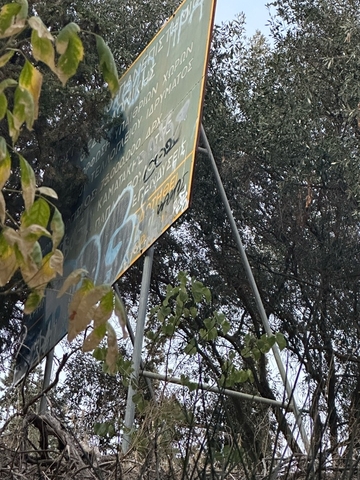 Πινακίδα προς κατάργηση. Καλύπτεται ολοκληρωτικά από δένδρα και έχει βανδαλιστεί. Αναγράφει τα ποσά σε δραχμές, που την καθιστά ακόμη πιο παλιά!!!