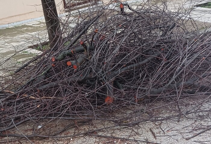 Κομμένα κλαδιά, μετά από πτώση δέντρου κατά την κακοκαιρία Barbara, ακόμη δεν έχουν μαζευτεί.