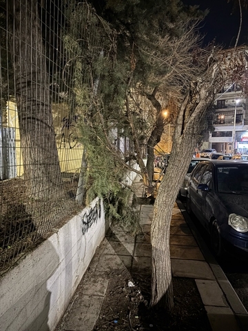 Στο σημείο έχει σπασμένα κλαδιά θέλει συντήρηση πέφτουν στον δρόμο σε διερχόμενα αυτοκίνητα και παρκαρισμένα