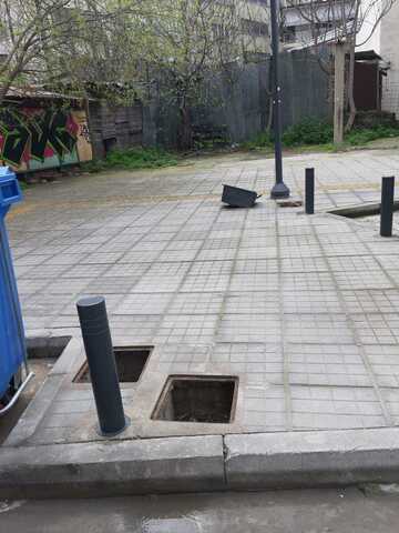 Ανάμεσα στις δύο παιδικές χαρές, στο φρεάτιο, οι πλάκες του πεζοδρομίου έχουν φουσκώσει-σηκωθεί και γεμίζει στάσιμο νερό! Πλημμυρικός κίνδυνος.