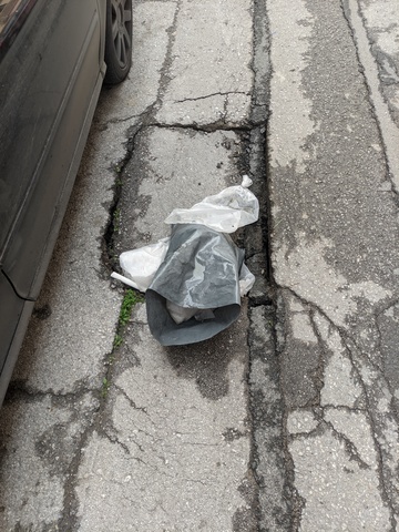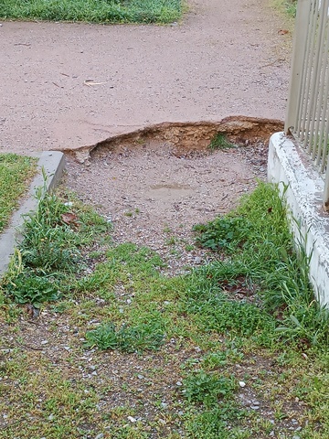 Τεράστια και επικίνδυνη λακκούβα. Έχει συγκεντρώσει και νερά και δεν φαίνεται το βάθος της που είναι αρκετό και κούφιο από κάτω. Κίνδυνος κατάρρευσης μεγάλου τμήματος που μπορεί να παρασύρει όχημα και πεζούς.Εχει τοποθετηθεί μαύρη σακούλα στην οπή για να μην πάρει νερά.