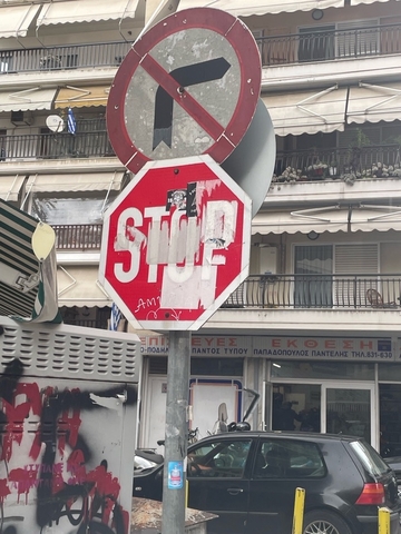Πρέπει να καθαριστεί η πινακίδα «απαγορεύεται να στρίψεις δεξιά» και η πινακίδα stop στην οδό Μπιζανίου 61