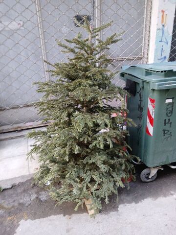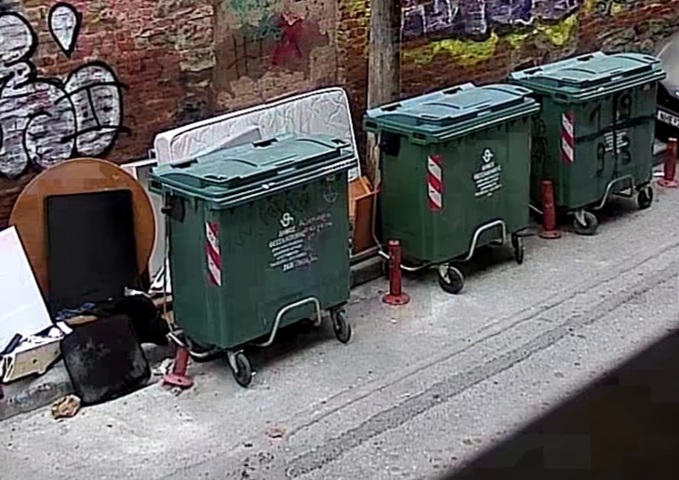 Παρατημένο στρώμα κρεβατιού, δίπλα στους κάδους σκουπιδιών.