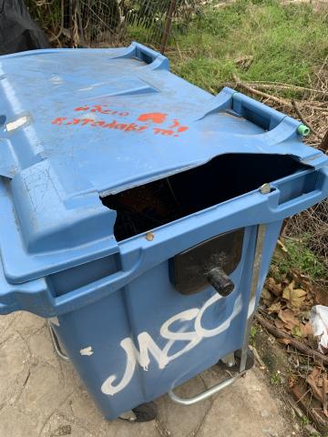 χθες κάηκαν δύο κάδοι ένας απορριμμάτων και ένας ανακύκλωσης και δεν έγινε ακόμη η αποκομιδή των κατεστραμμένων κάδων