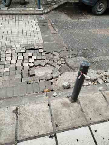 Τρυπες στο οδοστρωμα το οποιο εχει διαβρωθει 40εκ διπλα απο το πεζοδρομιο και σπασμενα πλακακια 4 χρονια προσπαθει να διορθωθουν